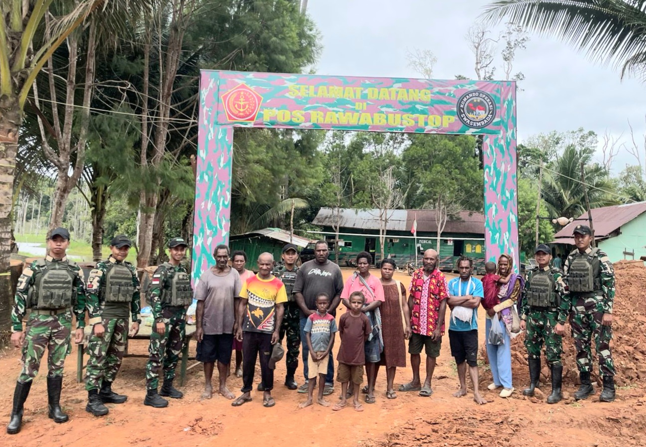 Nusapost-Boven Digoel. Pos Raw Bustop Satgas Pamtas RI-PNG Statis Yonif 403/Wirasada Pratista menggelar kegiatan bakti sosial pemberian sembako kepada masyarakat dalam rangka menyambut HUT ke-80 Tentara Nasional Indonesia tahun 2025, yang dilaksanakan di Pos Raw Bustop, Kampun Bustop Distrik Jair Kabupaten Boven Digoel, Propinsi Papua Selatan. (Minggu 5 Oktober 2025).